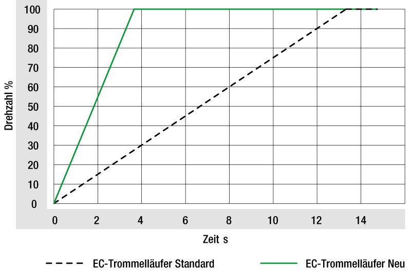 See for yourself: The new EC centrifugal blowers from ebm-papst start up faster than conventional EC models, whilst at the same time offering much quieter operation and greater energy efficiency. The "heart" of this speedy starter, available in fan sizes 160 and 250, is a GreenTech EC motor with a power of 0.75 kW. The graph on the right shows the time required to run up to maximum speed with an applied control voltage of 10 V.